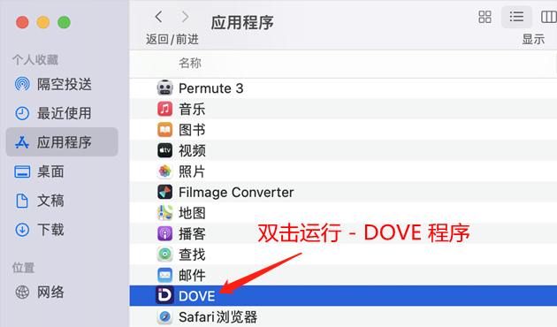 第4步:在应用程序中找到DOVE程序,并双击运行 - DOVE(注意:一定要在应用程序里运行DOVE)