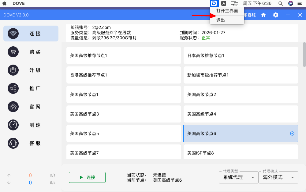 如要退出客户端:在电脑右上角,右键点击图标可以呼出和退出DOVE客户端