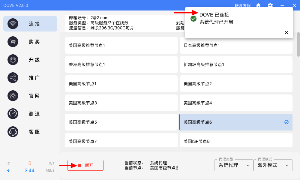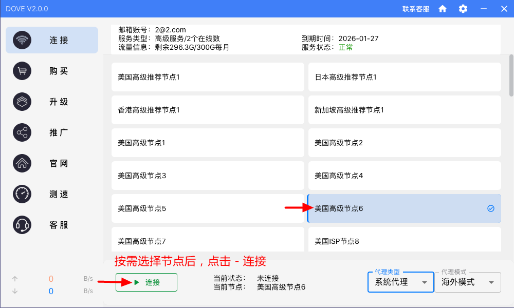 第8步:点击选择 - 服务器节点代理类型和代理模式都选择默认,然后点击 - 连接,提示 - DOVE已连接,就可以使用了(如图)