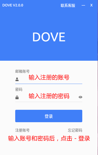 第6步:运行DOVE后,输入:您已购买服务的邮箱账号和密码,点击 - 登录(如图)